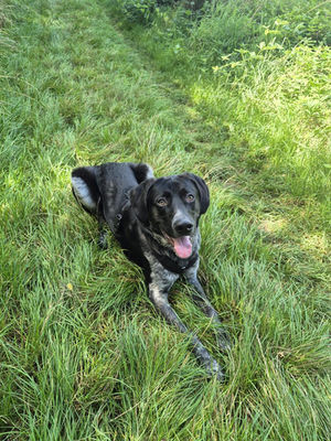 Er beherrscht die Grundkommandos, ist größtenteils leinenführig, fährt problemlos Auto und ist mit Katzen, Artgenossen und Pferden verträglich.
