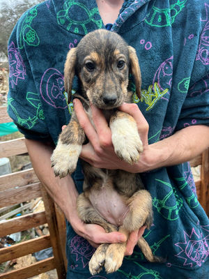 Ein Mann, der sich dort um Hunde kümmerte, hat die Hündin aufgenommen. Leider hat die arme Mama ihre Welpen draußen im Freien geboren.